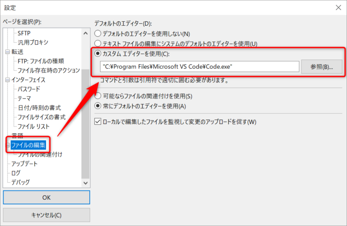 続いて「ファイルの編集」を選択して、カスタムエディタを使用から任意のエディタまでのパスを設定してあげてください。