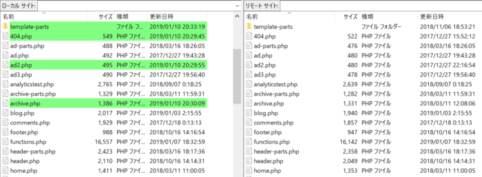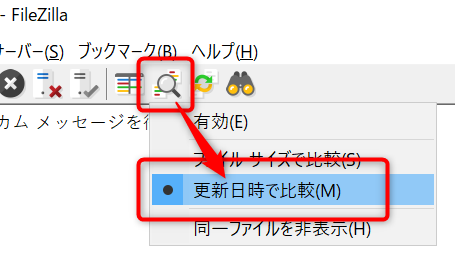 そして、左にローカルファイル、右にサーバーファイルを並べて、虫眼鏡アイコンをクリックすると更新日時が異なるファイルがハイライトして表示されるので、アップロード対象のファイルが視覚的に理解しやすいです。