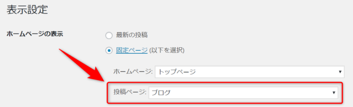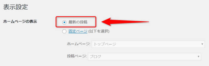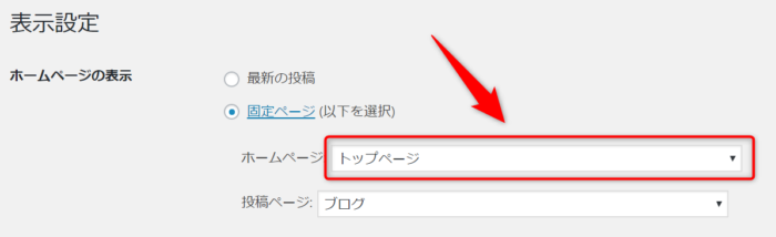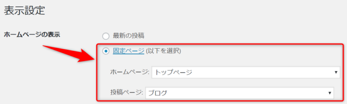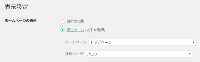 - 固定ページ・・・「ホームページ」に指定したページがトップページに表示されます