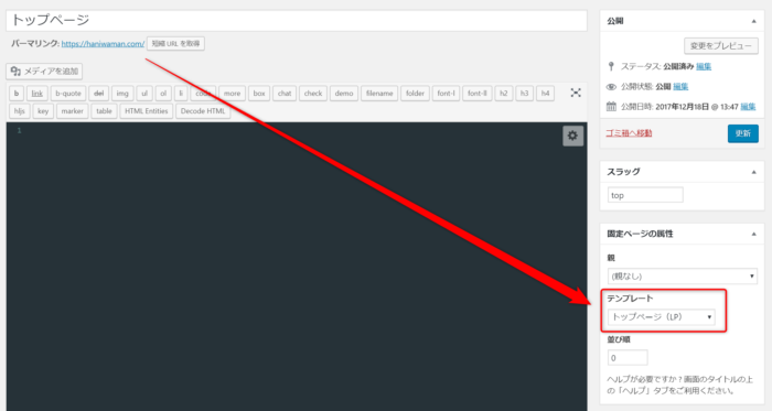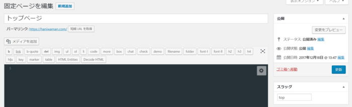 ちなみに、トップページになる部分なのでスラッグは機能しません。