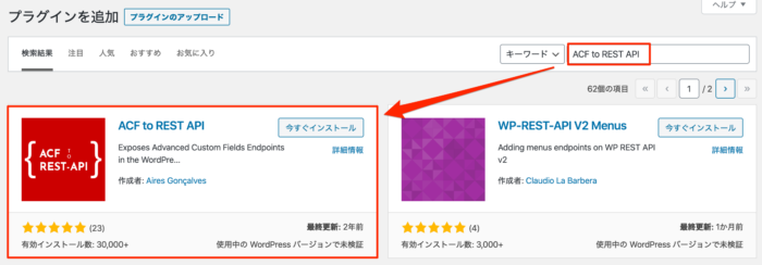 プラグイン → 新規追加 → キーワード「ACF to REST API」 → 今すぐインストール → 有効化