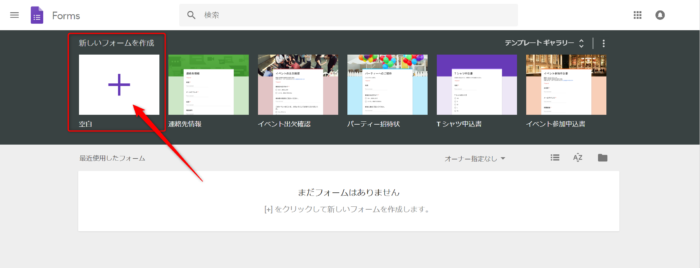 以下のGoogle フォームのページを開いて、「新しいフォームを作成」をクリックします。