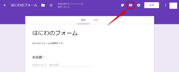 今の時点で、どんな表示になるかプレビューで確認してみましょう。右上の目のようなアイコンで確認できます。