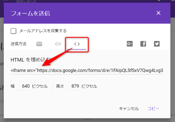 フォームが作成できたら、実際にサイトに埋め込んでみましょう。Googleフォームはiframeで吐き出してくれるので、サイト内で使うことができます。