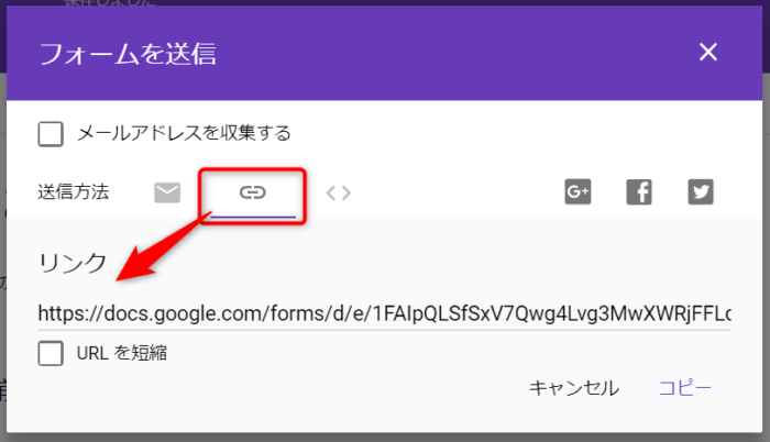 ちなみにリンクは真ん中のリンクアイコンから出力できます。例えば、社内で簡単なアンケートとりたい時とかGoogleフォームで作ってリンク投げるやり方とかいいんじゃないでしょうか。