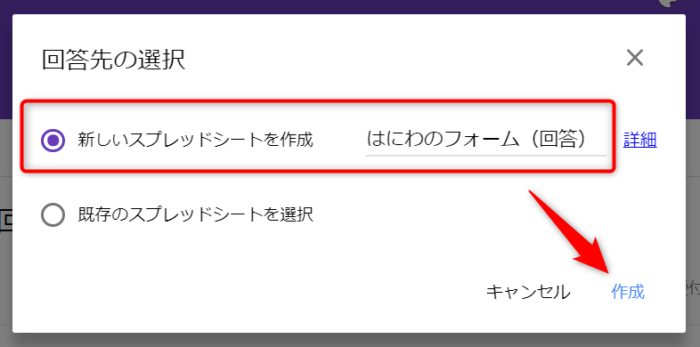 スプレットシートの選択ポップアップがでます。管理しやすいように新しいスプレットシートを作るのがいいかと思います。