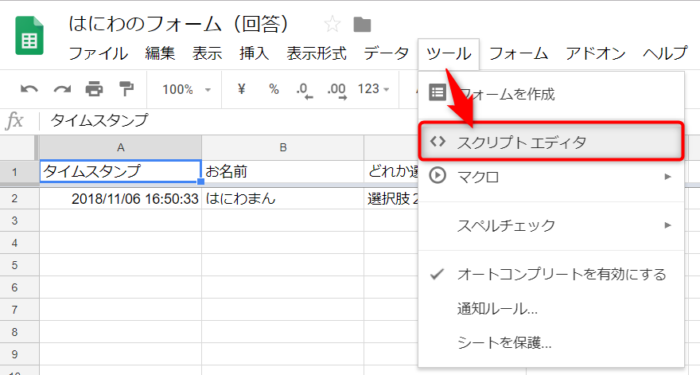 Googleフォームと連動したスプレットシートから、ツール → スクリプトエディタ を開きます。