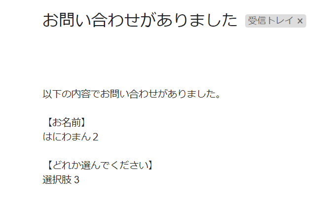 送信時のメール連動の準備ができたので、実際に送信してみましょう。スプレットシートに書き込まれてかつ、GASで指定したメールアドレスに送信されていればOKです。