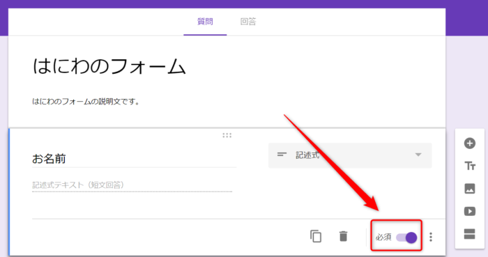 必須の場合は、右下の「必須」をチェックします。
