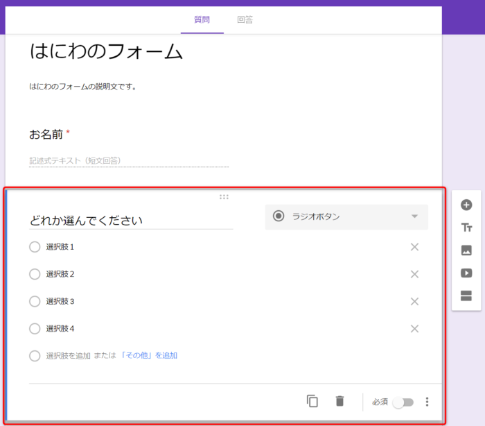 これを必要な分だけ繰り返していく感じですね。今回の例ではラジオボタン形式を1つ追加しました。