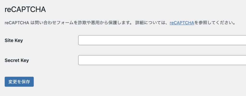 [WordPress管理画面]→[Snow Monkey Forms]→[reCAPTCHA]にアクセス。