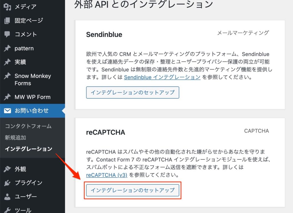 [WordPress管理画面]→[お問い合わせ]→[インテグレーション]→[reCAPTCHA]→[インテグレーションのセットアップ]にアクセス。