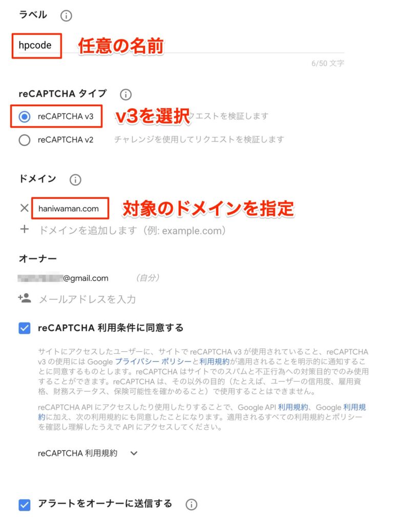 以下のとおりラベル、reCAPTCHAタイプ、ドメインを指定してください。