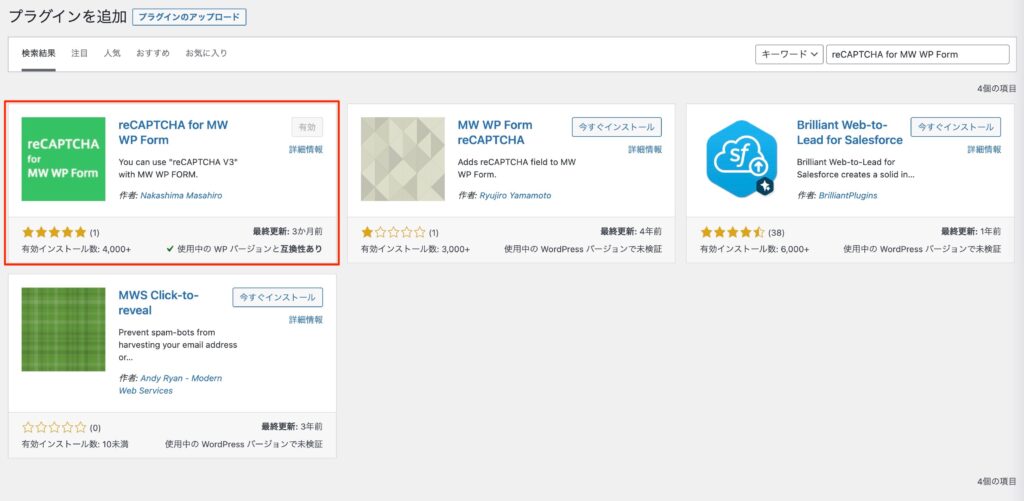 「reCAPTCHA for MW WP Form」プラグインを追加します。