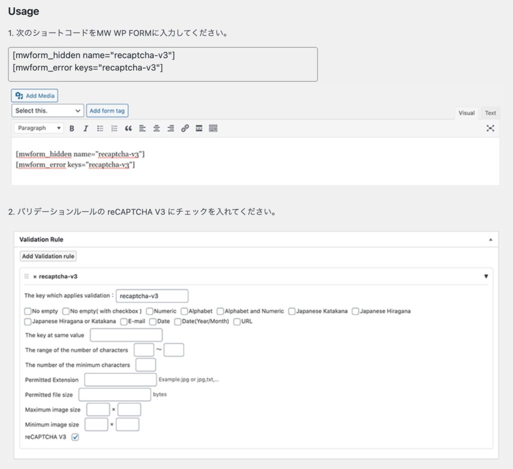 MW WP FormでreCAPTCHAを使う場合は、ショートコードの追加が必要になるので忘れずに追加してください。同ページの下部に案内があります。