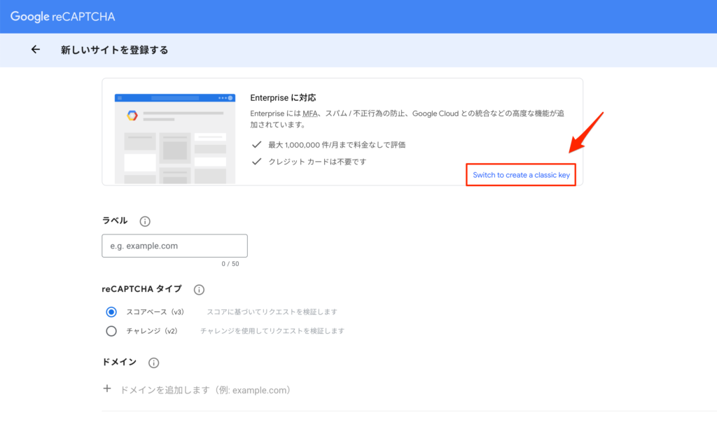 - ドメイン・・・reCAPTCHAを設置する対象のドメイン