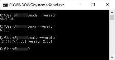 gulpはnpmコマンドを使って以下のとおりインストールします。コマンドプロンプトで以下のコマンドを実行してください。