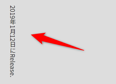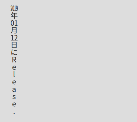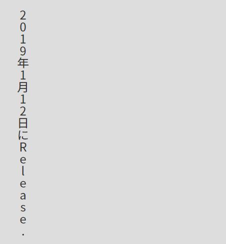 デフォルトだと、英語や記号は縦向きになりません。横文字をそのまま回転させたような表示のされかたとなります。「2019年1月12日にRelease.」という文字をwriting-mode: vertical-rl;だけで表示させると、以下のような表示になります。