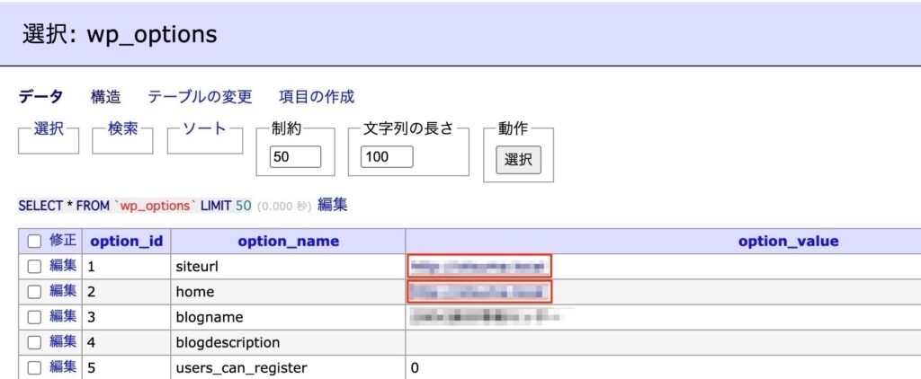 インポートした新DB内には、旧ドメインがたくさん登録されています。まずは管理画面にアクセスできる状態にしたいので、主要な値だけ変更していきます。