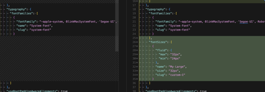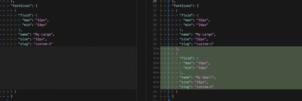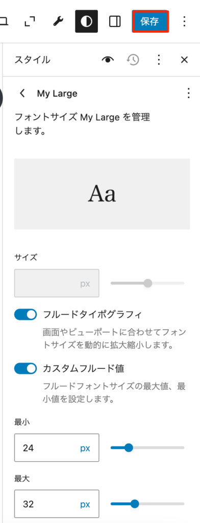 fluidmaxが最大値、minが最小値ですね。nameに設定したフォントサイズの名前が入っています。sizeは標準のサイズですね。仮に古いWordPressのバージョンだとfluidが使えないケースもある(と思う)ので、sizeもズレがない形で設定しておけると無難だと思います。