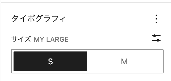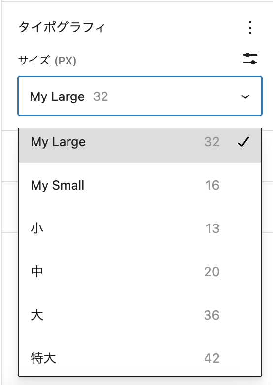 フォントサイズの選択肢を確認すると、追加した「My Large」「My Small」が選択可能になっています。数字の部分はsizeの値が入っています。さらに、デフォルトのフォントサイズもあることが分かります。