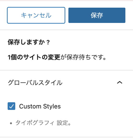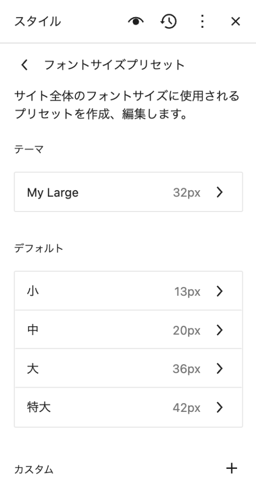 カスタムフォントサイズは追加というよりは一括の上書きのイメージとなります。先ほどtheme.jsonに書き出したので「My Large」は管理画面上ではテーマの方に移動したのですが、別のフォントサイズを追加しようと思ってカスタムフォントサイズを追加するとテーマのフォントサイズが上書きされてなくなります。