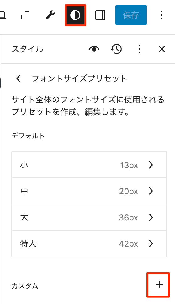 外観→エディター→スタイル→タイポグラフィ→フォントサイズ→フォントサイズプリセット