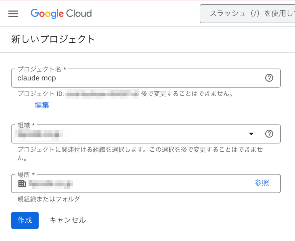 まずプロジェクトを作成しましょう。プロジェクト名は任意ですが自分は「claude mcp」としました。