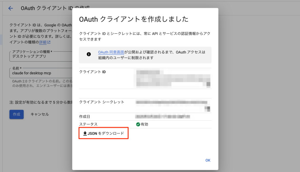 クライアント ID とシークレットキーが発行されます。「JSONをダウンロード」からファイルとして保存しておきます。※もし保存し忘れても認証情報の一覧からいつでもダウンロードできます。