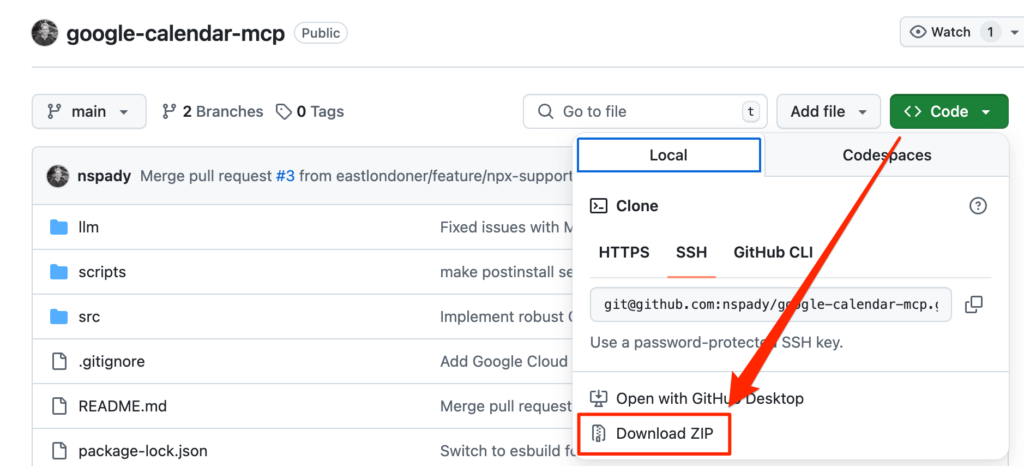 https://github.com/nspady/google-calendar-mcp」のファイル一式をダウンロードします。gitコマンドが分かる方はcloneでも良いですし、右上のCode→Download zipからでも問題ありません。
