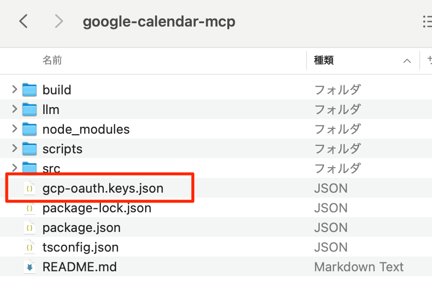 google-calendar-mcpのルートの直下に、Googleの認証情報のファイル「gcp-oauth.keys.json」を格納します。