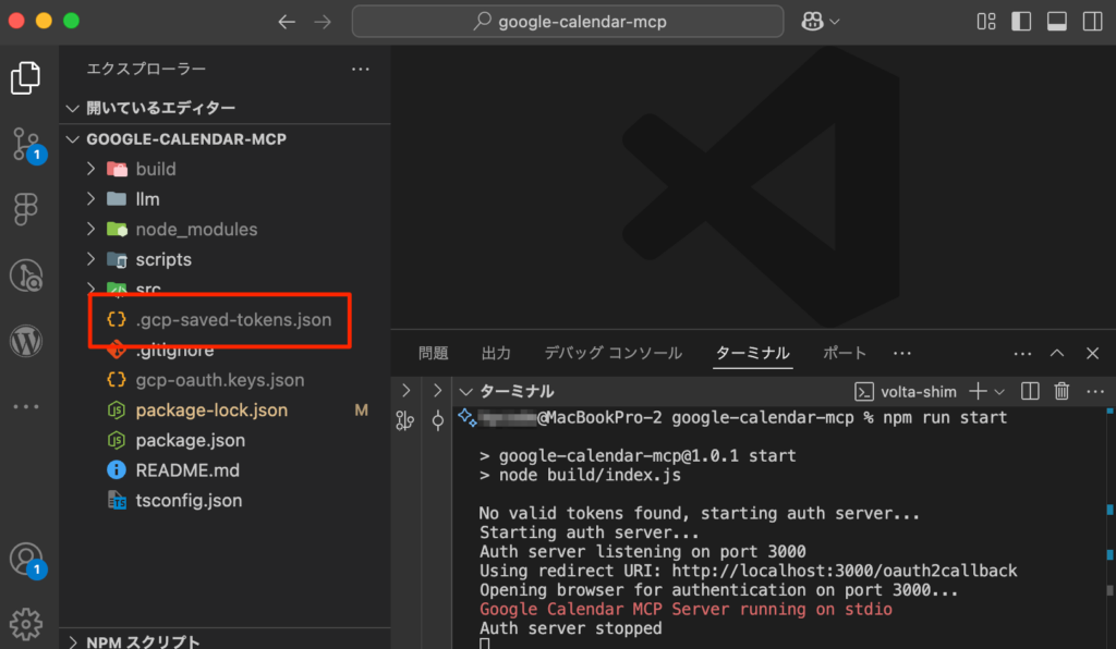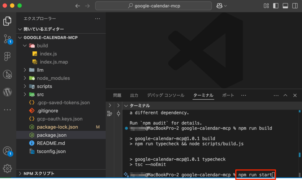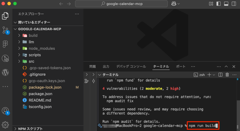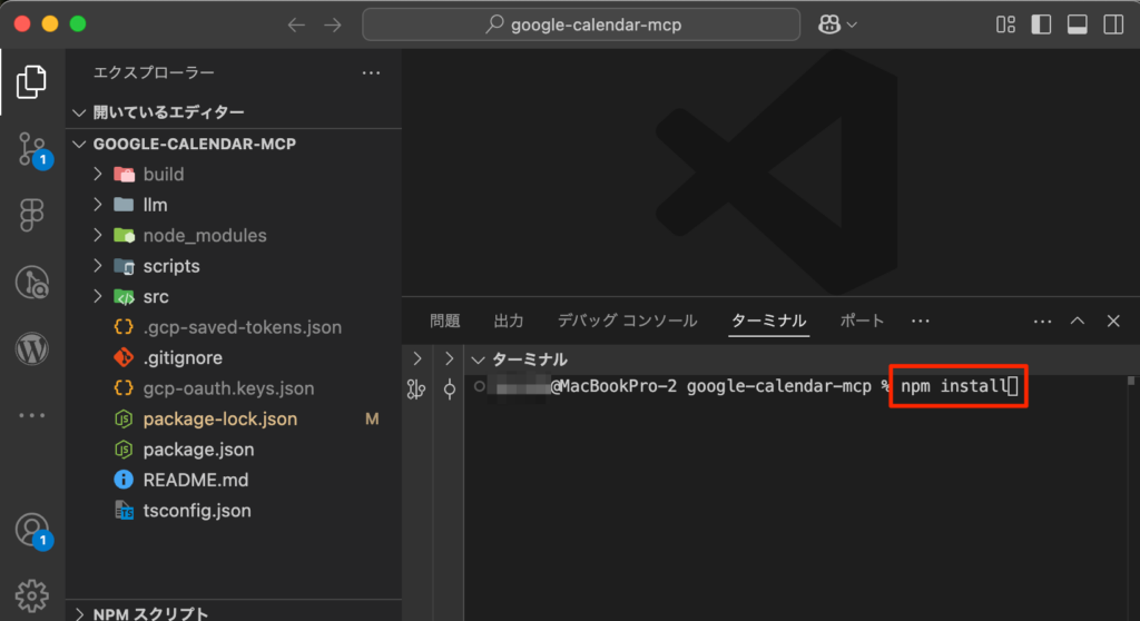 google-calendar-mcpフォルダをVS Codeを開いて、npm installします。※ 自分の画面は様々なコマンド実行後なので最初の状態と異なっております。