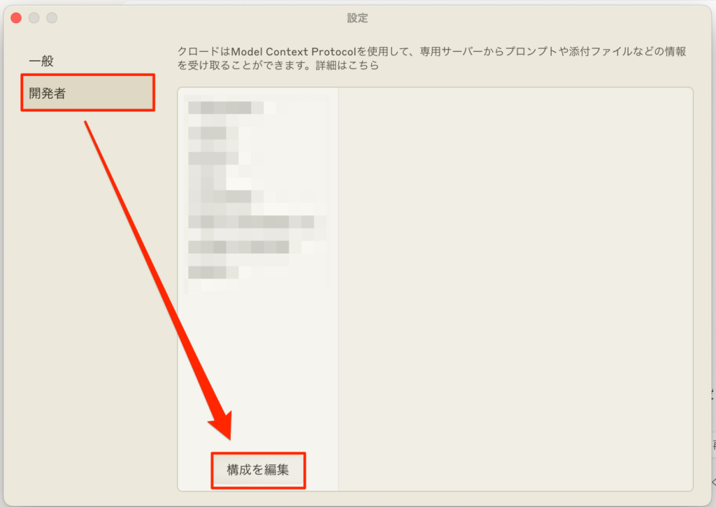 Claude for Desktopを開いて、左上のメニューから「設定」を開きます。「開発者」のタブの「構成を編集」をクリックしましょう。