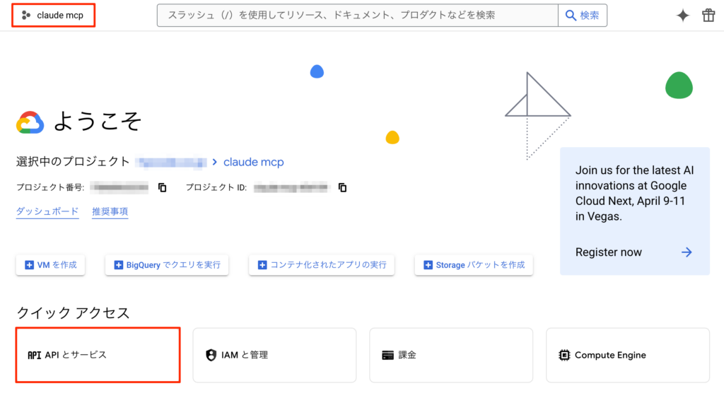 左上のプルダウンから作成したプロジェクトを選択します。そして、クイックアクセスから「APIとサービス」を開きましょう。
