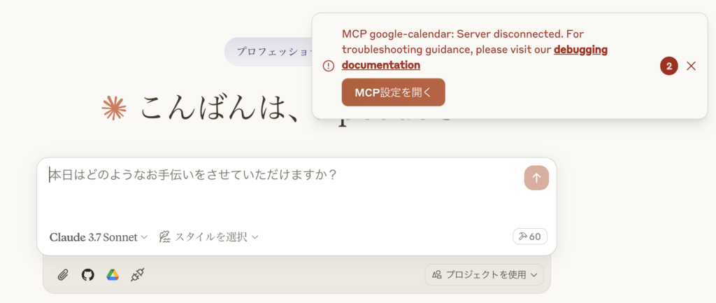 エラーが出ました。エラーが出る場合は、「MCP設定を開く」からログを確認して原因を確認します。ログは呪文のように見えるかもしれませんが、AIに質問すればすぐに解決すると思います。