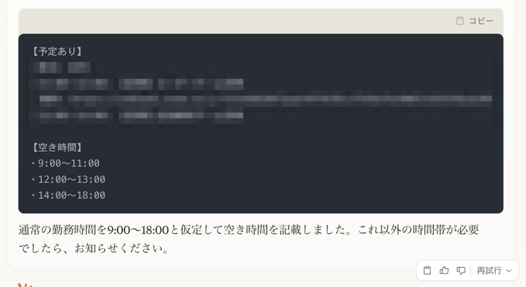 Googleカレンダーから明日の空き予定を教えてください。コピペで共有しやすい形でお願いします。