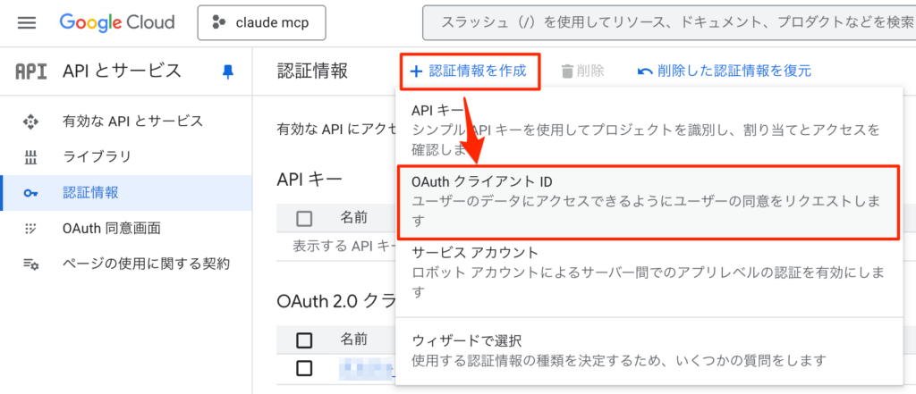 「認証情報を作成」から「OAuthクライアントID」を選択します。