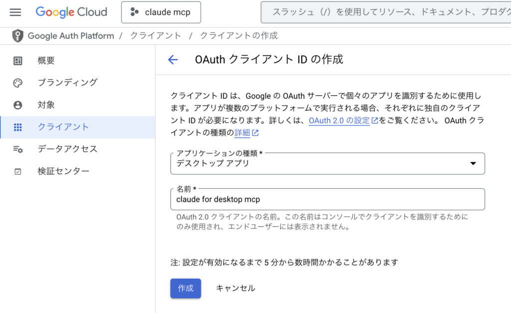 アプリケーションの種類は「デスクトップアプリ」で、名前は任意ですが「claude for desktop mcp」としました。