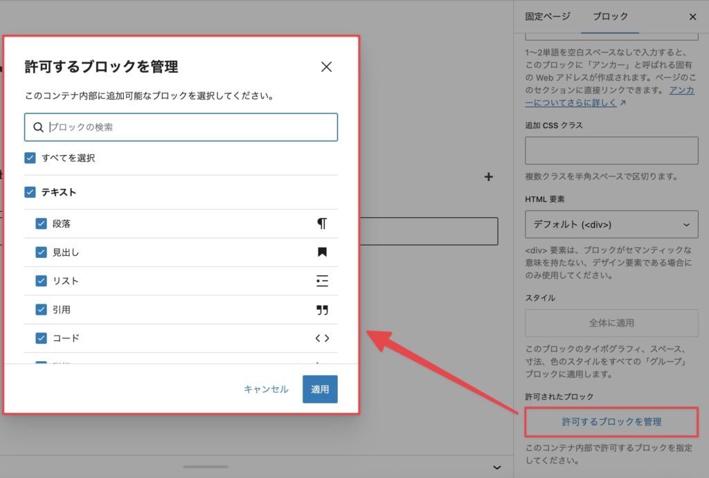 グループブロック内は自由にブロックを追加できますが、追加できるブロックを制限することが可能になります。意図しないブロックの挿入を防ぐことができそうです。ブロックを使ったパターンに活用できそうな気がします。