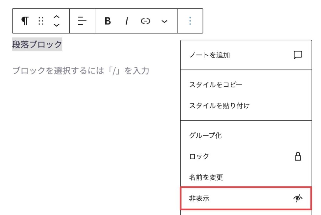 ブロックを非表示にすることができます。非表示にすると、編集画面には存在するけど公開されているサイトには表示されない、という設定にすることが可能になります。