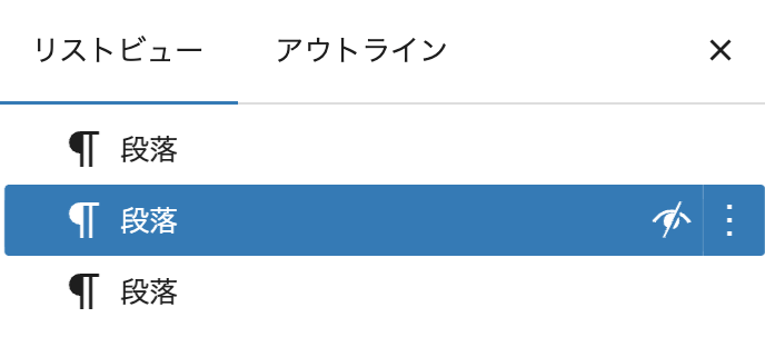 非表示にしたブロックはリストビューに非表示を表すアイコンが追加されるようになります。