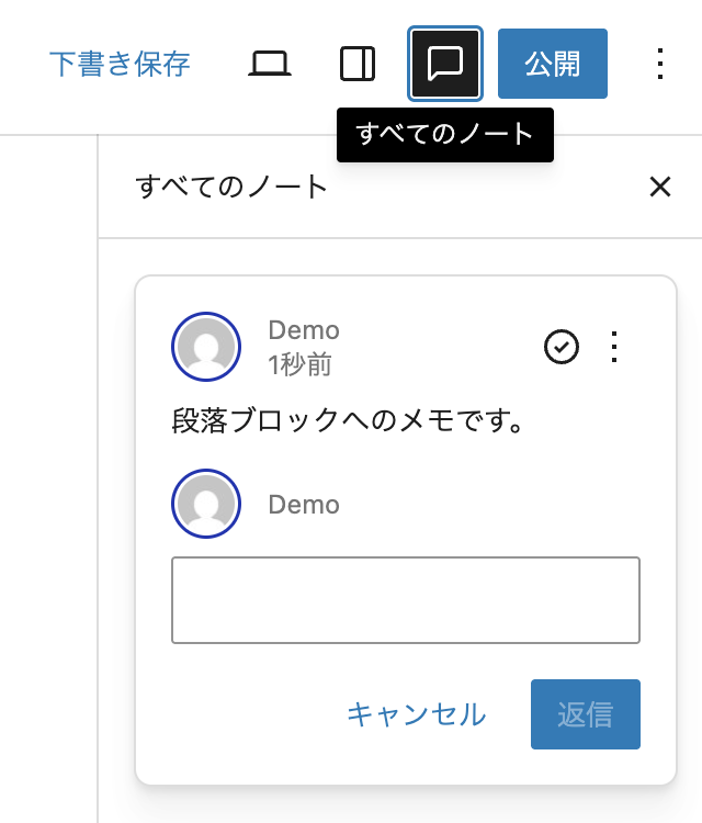 ノートが追加されると、右上の公開ボタンの横あたりにノートのアイコンが追加されてすべてのノートを見ることが可能になります。