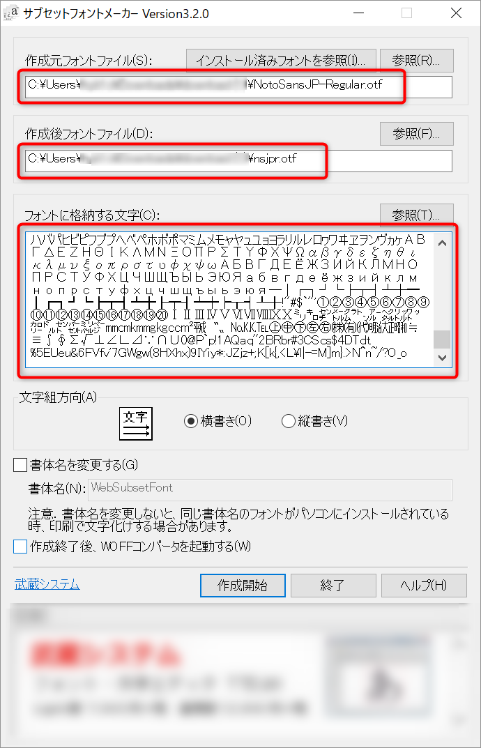 変換前ファイルには、ダウンロードした「Noto Sans Japanese」のファイルを指定。変換後ファイルには、変換後に生成するフォルダの指定 & 適当なファイル名(このファイル名でサブセット化されます)を指定します。