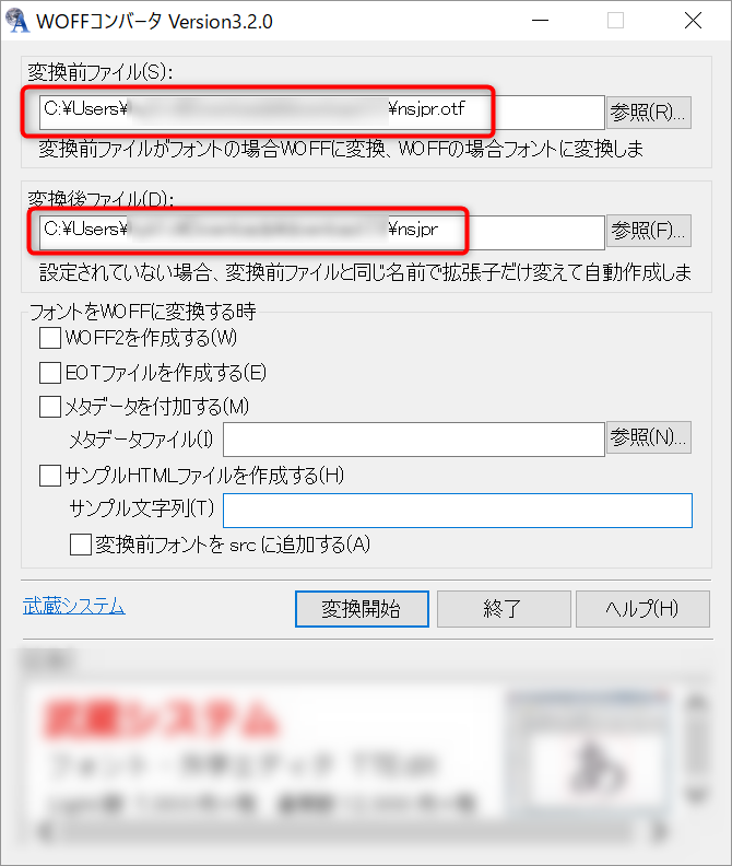 変換前ファイルには、先ほど「サブセットフォントメーカー」で作成したotfファイルを指定。