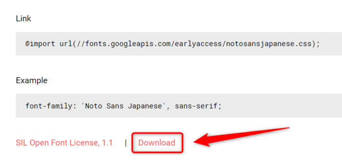 「Noto Sans Japanese」には、「SIL Open Font License 1.1」というライセンスが適応されています。