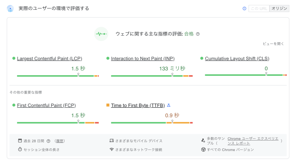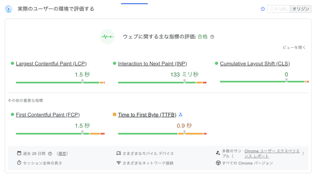 そして、実は上の方に「実際のユーザーの環境で評価する」というセクションがあります。こちらが「フィールドデータ」の結果になります。