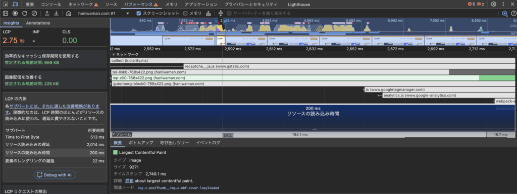 パフォーマンスのLCP の内訳から「リソースの読み込み時間」をクリックすると、LCPの対象となっているリソースを確認できます。