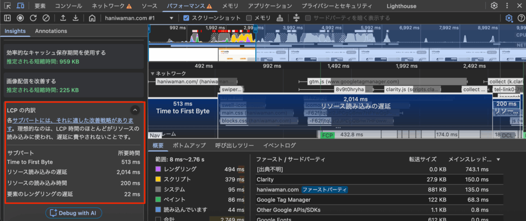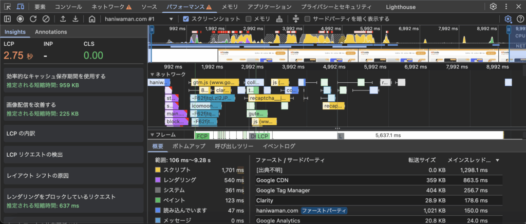 おすすめなのは、実際の数字が改善しているかどうか確認しながら進める方法です。そのために「パフォーマンス」「ネットワーク」が参考になります。