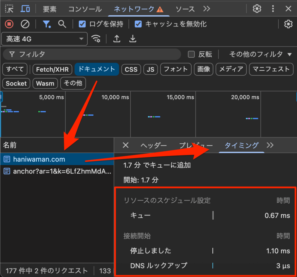 Time to First Byte(TTFB)の内訳をさらに確認したいので、ネットワークも確認してみます。ネットワークを開いて、ドキュメントを押します。すると、名前の列に開いているページが表示されると思いますので選択して、右側の「タイミング」を開いてみてください。