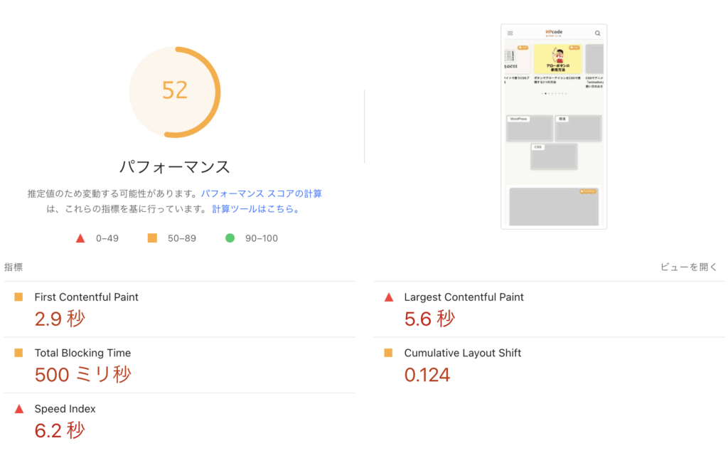 実際に見てみましょう。以下は2025年11月時点の「https://haniwaman.com/」のPageSpeed Insightsでの結果です。「ラボデータ」のパフォーマンスの結果として52点ということが分かります。